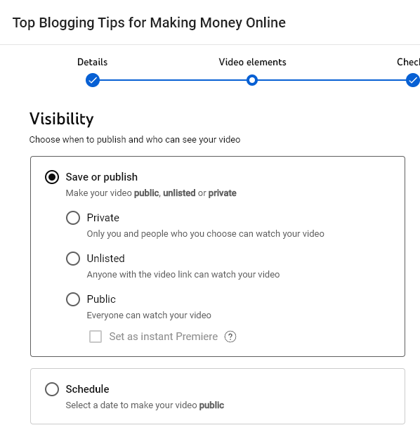 Finally, youโll have the option to schedule or publish your video. You can also keep it private if youโre not ready to publish it yet: